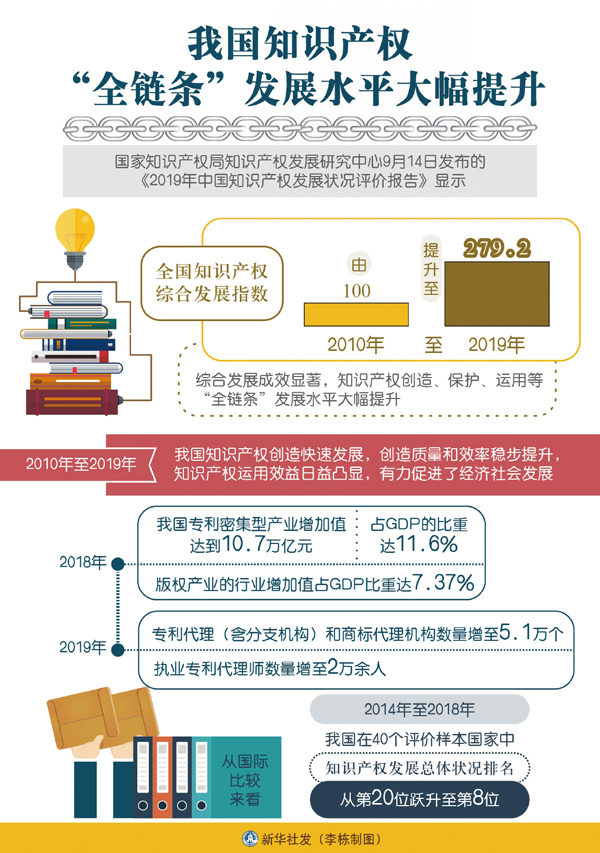 ——在完善法律法規(guī)方面,基本建立起符合國際通行規(guī)則、門類較為齊全的知識產權法律制度,實現(xiàn)了專利、商標、地理標志等知識產權的全方位、立體化保護。加入世貿組織以來,中國先后多次修訂專利法、商標法和著作權法等法律,基本形成了知識產權“嚴保護”的法律制度體系。